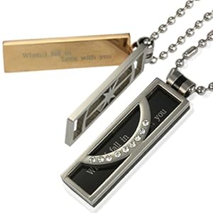 The pair of stainless steel black and gold tone bar pendant necklaces set has silver star in one pendant and cubic zirconia moon in another. Both pendants have the message "When I fall in Love with you". The silver star and moon is designed to be movable. The pendant measures 0.43 inches (11mm) wide and 1.58 inches (40mm) high. This set comes with a stainless steel round and oval bead chain in 16 inches length and a stainless steel bead chain which is available in 20, 22, or 24 inches length. We use high quality stainless steel which has high resistance to rust, corrosion and tarnishing and requires minimal maintenance in order to keep jewelry looking like new.
