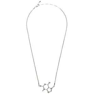 Theobromine (chocolate) molecular jewelry necklace. Despite its naturally bitter taste, we love it dearly. Theobromine is a mild stimulant related to caffeine that makes up about 2 percent of cacao beans. This molecule is thought to elevate mood. Now you can give chocolate in a whole new way, give a gift that combines art with science. Each piece of molecular jewelry includes an informational card describing the science that inspired the piece. Sterling silver pendant is approximately 1-1/2" wide and attached to a 16-18" sterling silver, snake chain with lobster clasp. Made in the USA and packaged in an attractive recycled gift box complete with a ribbon. You can't go wrong with the gift of molecular jewelry.